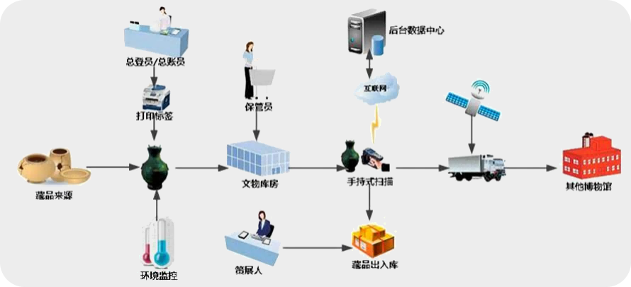 利用RFID、二維碼、條形碼、雙向數(shù)據(jù)通信技術(shù),結(jié)合藏品全流程管理業(yè)務,實現(xiàn)藏品實體及其信息的遠程、非接觸式、一體化管理。